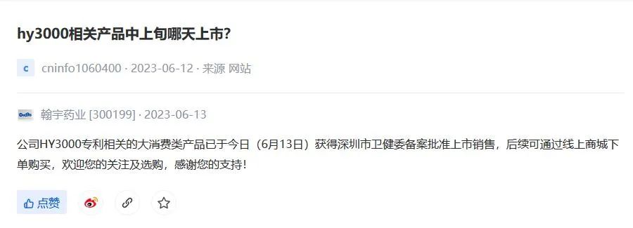 遗憾的是,随着疫情管控不断变化,上市迟缓的HY3000鼻喷雾剂未吃到多少红利。直到2023年6月13日,翰宇药业在投资者平台上称:“公司HY3000专利相关的大消费类产品已于今日(6月13日)获得深圳市卫健委备案批准上市销售。”