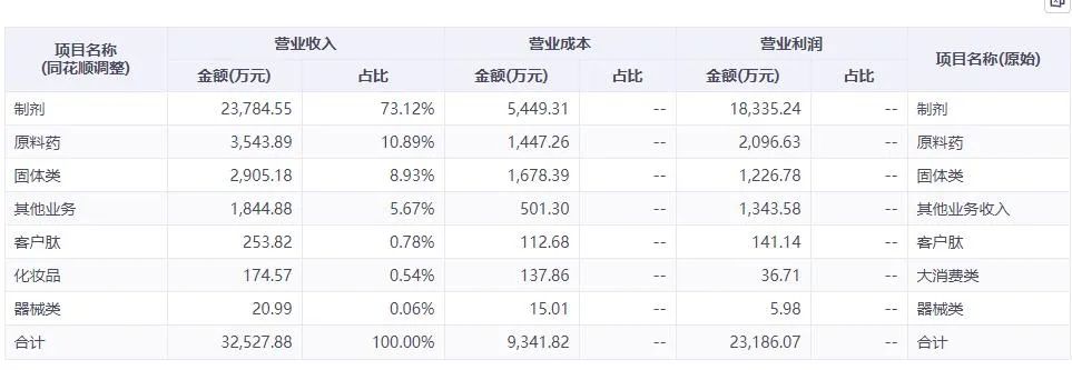 2023中报显示,制剂产品为营收主要品类:上半年收入2.38亿元,占营收比73.23%。其次是原料药、固体类,营收3543.89万元、2905.18万元,占比为10.89%、8.93%。