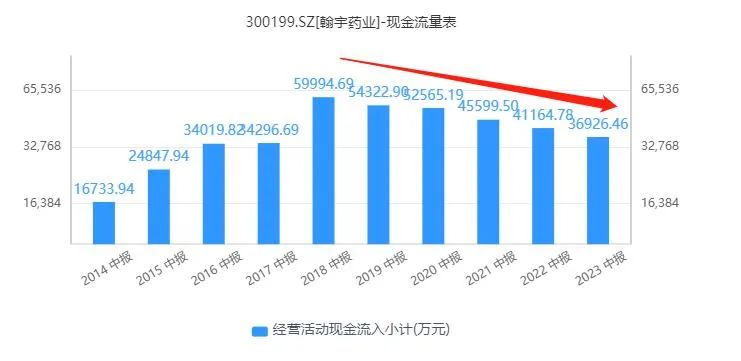 拉长维度,翰宇药业已连续多年业绩表现不佳。2018年到2022年五年间,公司仅2021年靠投资实现盈利3081万元,其余四年累亏约22亿元,扣非净利更连续5年为负。经营活动现金流入呈持续下滑趋势,从2018年中报的5.99亿元降至2023年中报的3.69亿元。