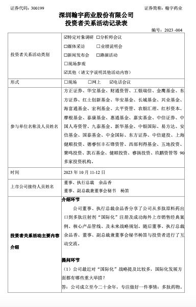 深圳翰宇药业股份有限公司(以下简称“翰宇药业”或“公司”)10月13日晚间发布公告称,公司于10月11日-12日接受了多家机构投资者的特定对象调研和现场参观。在活动中,翰宇药业透露,翰宇药业是为数不多的A股多肽上市公司里,最终能获得美国大药企认可,将商业批的GLP-1多肽原料药成功销往美国,9月签下折合2.19亿元大订单的公司。且已进入分批生产和发货状态。