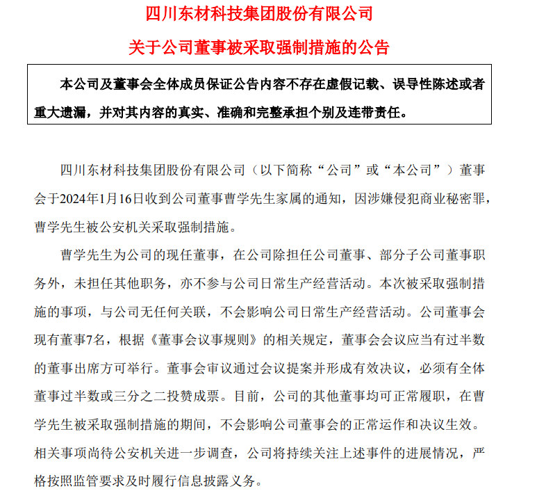 另据东材科技(四川东材科技集团股份有限公司)16日晚间公告,公司董事曹学因涉嫌侵犯商业秘密罪,被公安机关采取强制措施。
