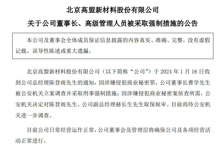 17日盘前,高盟新材公告称,公司于2024年1月16日收到公司总经理陈登雨的通知,因涉嫌侵犯商业秘密罪,公司董事长曹学被公安机关立案调查并采取刑事强制措施;因涉嫌侵犯商业秘密案侦查所需,公安机关决定对陈登雨、公司副总经理赫长生取保候审。目前尚待公安机关进一步调查。