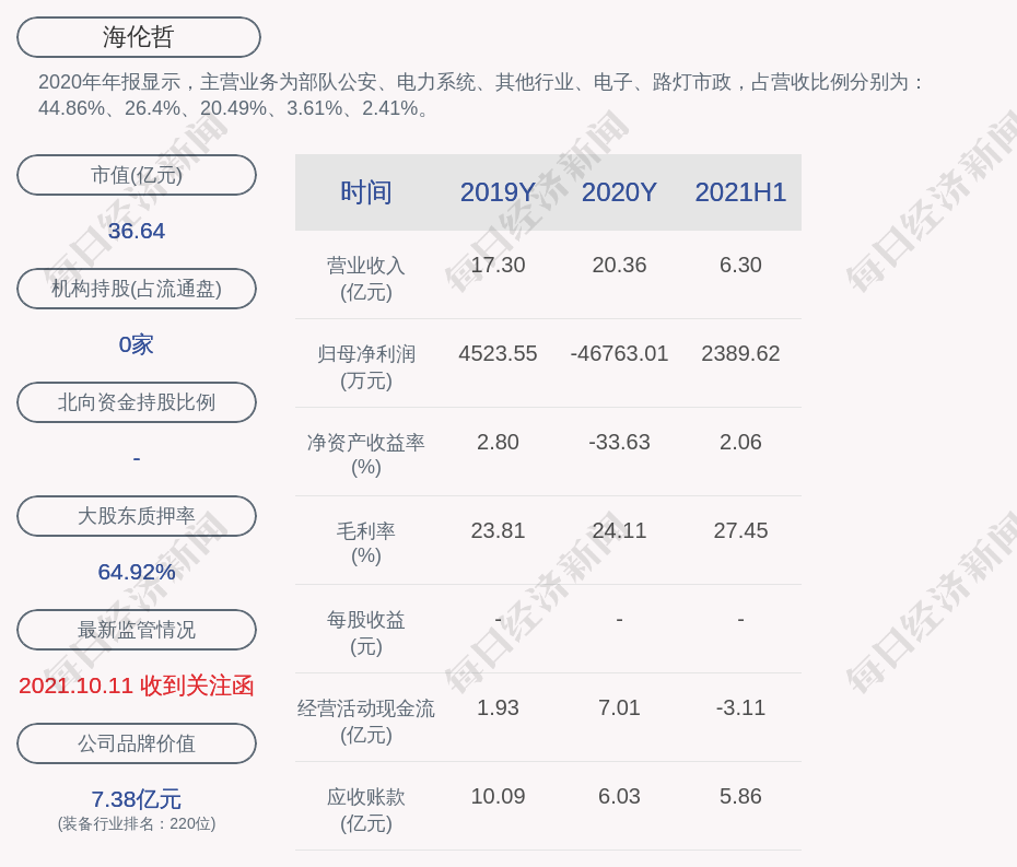 2020年年报显示,海伦哲的主营业务为电力系统、电子、路灯市政等。