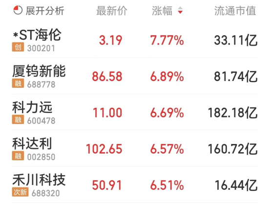 其中,*ST海伦、厦钨新能、科力远、科达利、禾川科技位列板块涨幅前五位,涨幅分别为7.77%、6.89%、6.69%、6.57%、6.51%。