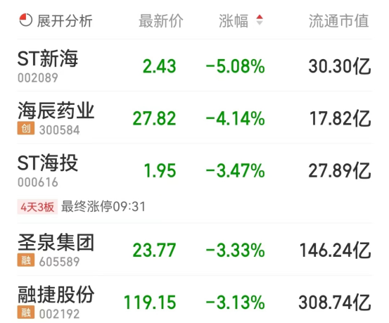 ST新海、海辰药业、ST海投、圣泉集团、融捷股份位列涨幅榜后五位,涨幅分别为-5.08%、-4.13%、-3.46%、-3.33%、-3.13%。