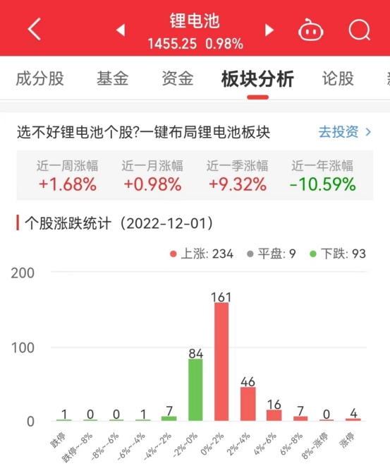 中国经济网北京12月1日讯今日,锂电池板块整体涨幅0.98%,其中234只股票上涨,9只股票平盘,93只股票下跌。