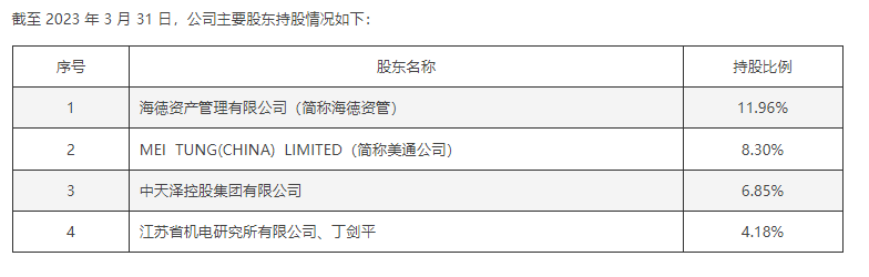 钛媒体APP注意到,目前,海伦哲的股权较为分散。海徳资管、美通公司、中天泽以及江苏省机电研究所及丁剑平分别持股11.96%、8.3%、6.85%和4.18%。