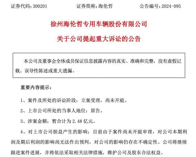 11月19日晚,海伦哲公告称,公司作为原告,近日向江苏省徐州市中级人民法院提起诉讼,并收到《受理案件通知书》,案件已立案受理,但尚未开庭。