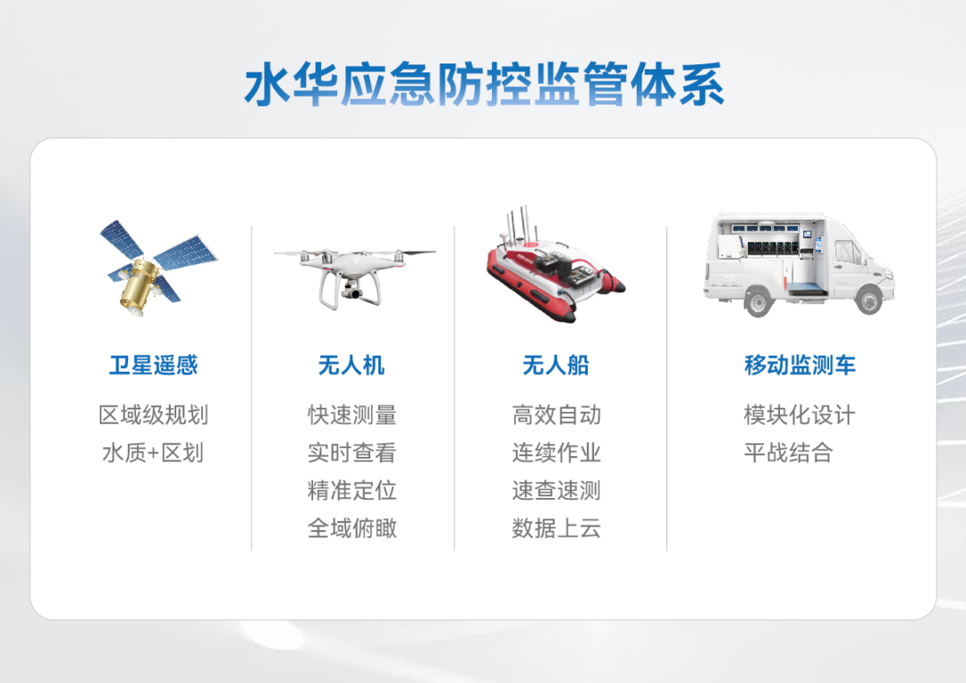 卫星遥感获取影像→无人机俯瞰巡测→无人船水域巡航→移动监测车应急响应。通过“空-天-地”全方位应急防控手段,助力水华监测预警-应急防控监管体系建设,实现水华监管精细化。