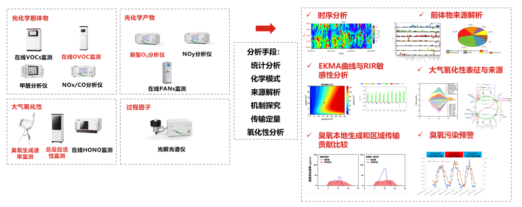通过环境空气含氧类挥发性有机物(OVOCs)自动监测系统、臭氧生成速率(OPR)连续监测系统大幅度提升了光化学网络的监测能力,形成了一整套全新的臭氧污染精准防控的解决方案。该解决方案对光化学污染的全流程实施监测,包含前体物监测,过程因子监测,氧化性监测与光化学产物监测。有效帮助实施对光化学污染过程机制研究,臭氧来源解析,臭氧传输分析和臭氧预警管控。