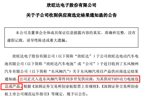 9月6日,欣旺达发布公告称,子公司欣旺达电动汽车电池于近日收到东风柳汽的供应商选定结果通知函,公司正式入选东风柳汽零件同步开发供应商,为其供应T5EV动力电池包总成产品。