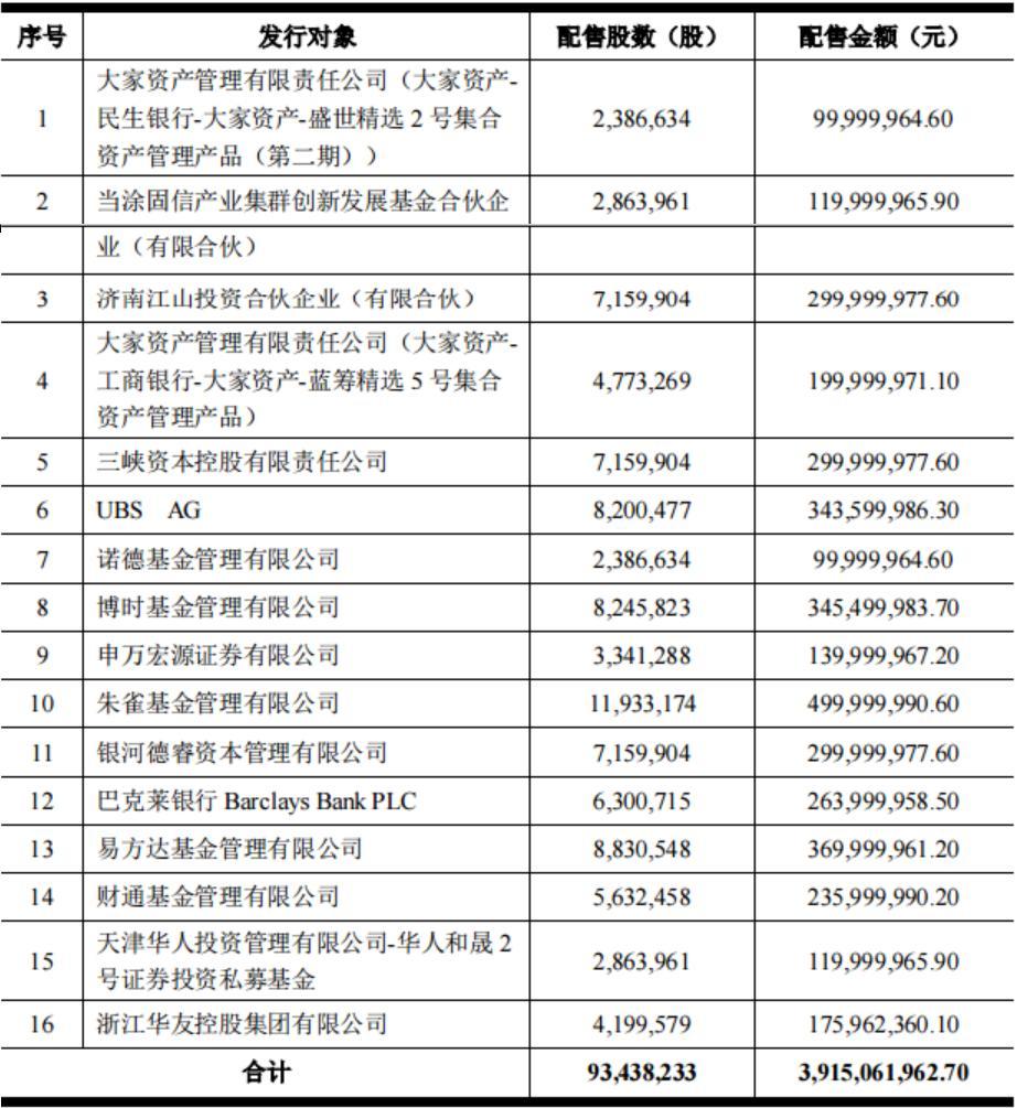 私募机构方面,朱雀基金获配1193.32万股,获配金额约为5亿元,是参与定增的所有机构中获配最多的一家;此外千亿私募高毅资产、景林资产等也参与了报价。