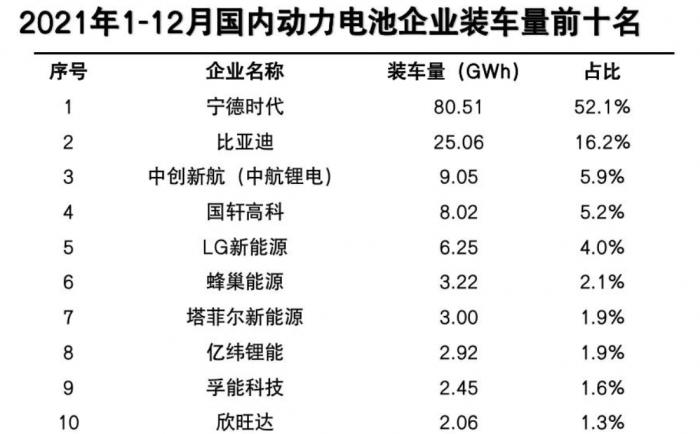 中国汽车动力电池产业创新联盟数据显示,2021年1-12月,国内动力电池企业装车量TOP10的企业分别为:宁德时代(52.1%)、比亚迪(16.2%)、中创新航(中航锂电)(5.9%)、国轩高科(5.2%)、LG新能源(4.0%)、蜂巢能源(2.1%)、塔菲尔新能源(1.9%)、亿纬锂能(1.9%)、孚能科技(1.6%)、欣旺达(1.3%)。