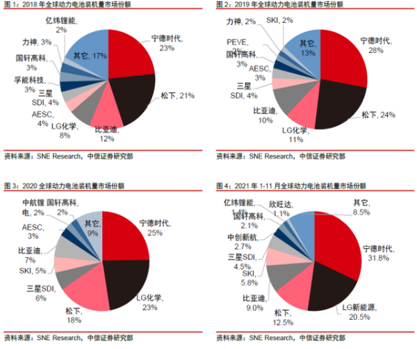 而宁德时代在2021年1~11月全球动力电池装机量的情况是,以31.8%的市场占有率稳居全球第一。