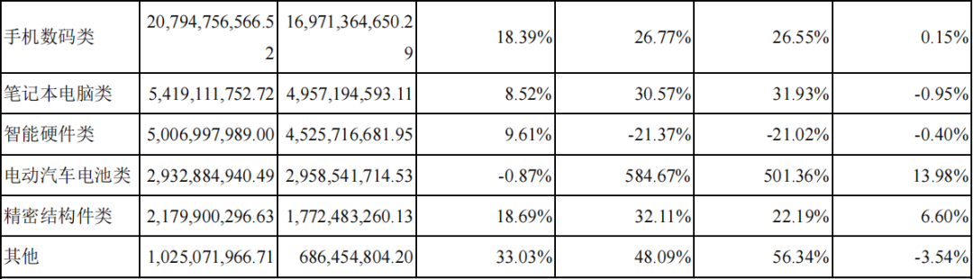 值得注意的是,2021年欣旺达动力电池业务实现显著增长。电动汽车电池类产品实现营收29.33亿元,同比增长584.67%,占总营收比重为7.85%,同比增加6.41个百分点。
