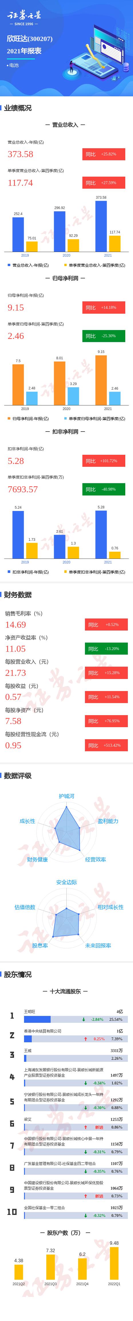 欣旺达2021年报显示,公司主营收入373.59亿元,同比上升25.82%;归母净利润9.16亿元,同比上升14.18%;扣非净利润5.28亿元,同比上升101.72%;其中2021年第四季度,公司单季度主营收入117.75亿元,同比上升27.59%;单季度归母净利润2.46亿元,同比下降25.3%;单季度扣非净利润7693.58万元,同比下降40.98%;负债率67.75%,投资收益3698.1万元,财务费用5.22亿元,毛利率14.69%。