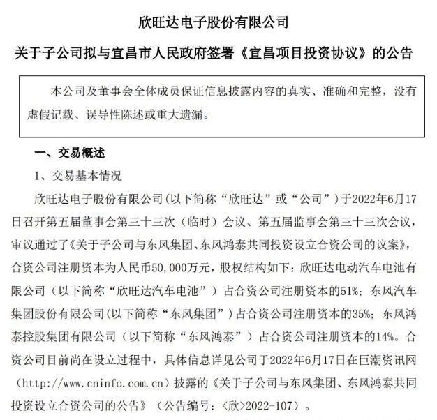 在此前的6月17 日,欣旺达召开了第五届董事会第三十三次(临时)会议,审议通过了《关于子公司与东风集团、东风鸿泰共同投资设立合资公司的议案》,合资公司注册资本为人民币50000万元。