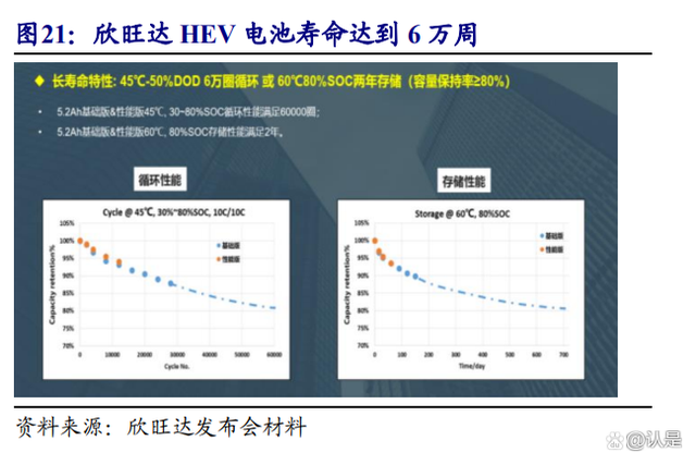 (2)经营 HEV 电池赋能了欣旺达在快充及长循环寿命电池的研发进展,有望帮助公司在研发长寿命储能电池上占领先机。由于 HEV 电池对充放电倍率及循环寿命要求高,欣旺达在 HEV 的主流产品倍率性能已经达到 80C,可以实现 10 秒释放 30%的电量;50%DOD 的充放条件下循环次数达到 6 万次。而欣旺达 2022 年 9 月在行业内率先发布充电功率达到 480kW 的超级快充电池产品,技术正是源于 HEV 电池的大功率充放电技术。公司在长寿命 HEV 电池的多年研发经验,有望帮助公司在研发储能领域使用的长寿命电池上抢占先机。