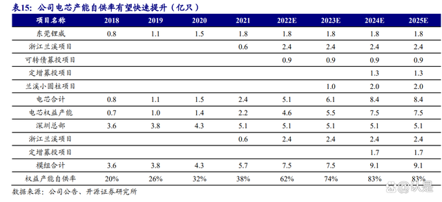 产能迅速扩容,未来自供率有望不断提升。在行业终端需求稳步提升及集中化趋势下,公司不断扩展高端客户,消费电池订单需求快速提升。浙江兰溪年产 2.4 亿只消费电芯及模组产线已于 2021 年 8 月正式投产;年产 0.94 亿只消费电芯可转债项目预计将于 2022 年全部投产;定增项目规划的年产 1.25 亿只消费电芯以及 1.65 亿只消费模组产线预计将于 2024 年投产。2022 年 5 月公司公告在兰溪规划 3.1 亿只小圆柱电芯产能,一期 1 亿只预计将于 2023 年底投产。预计到 2025 年公司电芯产能将达到 8.4 亿只,模组产能达到 9.1 亿只,产能权益自供率将提升到 82.6%,持续增厚公司利润。