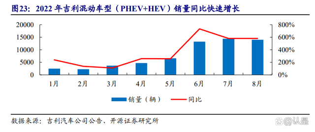 吉利完成雷神混动系统突破,2022 年混动月度销量同比快速增长。2021 年 10 月吉利发布雷神动力系统,在动力性、可靠性、平顺性、NVH 表现、尾气排放和油耗水平上等六个方面达到了行业领先。2022 年 4 月首款搭载雷神动力系统的星越 L 上市,上市 5 个月销量突破 1.4 万辆,支撑吉利混动销量从 4 月的 4707 辆上升至 8 月的 1.4 万辆。2022 年 1-8 月吉利混动销量达到 6.1 万辆,同比增长 397%。2022 年吉利预计将发布 8 款以上雷神混动车型,有望支撑 2023 年混动车型大幅放量,公司新建成混动电池产能有望得到快速消化。