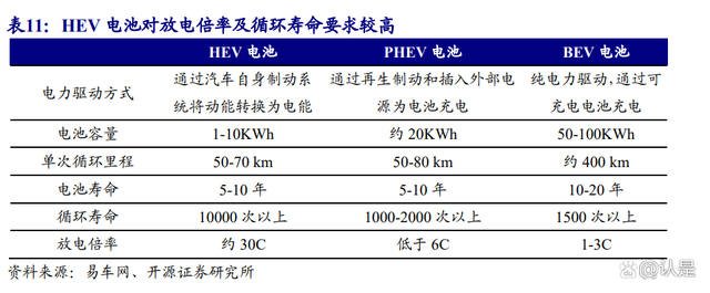 HEV 电池相比 BEV 电池在放电倍率及浅充放循环寿命上有较高的技术壁垒。 HEV 车型可以利用汽车自身制动系统将动能转换为电能,对电池容量及能量密度要求更低,但是对电池浅充浅放次数及放电倍率要求更高,相比 BEV 电池要求要求的循环 1500 次以上、放电倍率 1-3C,HEV 电池要求循环 10000 次以上、放电倍率需要达到约 30C,技术壁垒明显高于 BEV 电池。
