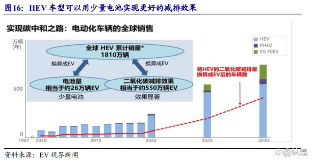 HEV 车型可以用少量电池实现更好的减排效果,是电池产能持续紧缺背景下推动汽车电动化的重要解决方案。相比其他类型电动化汽车,HEV 车型的电池安装需要对现有燃油车平台进行较大改动,因此需要和下游车企从研发端开始紧密合作,客户粘性强,技术壁垒高。同时据丰田汽车发布会公布数据,当前丰田 HEV 全球累计销量 1810 万辆,相当于用 26 万辆的 BEV 对应电池实现了相当于 550 万辆 BEV 的减排效果,是当前电池产能持续紧缺背景下,替代燃油车推动汽车电动化的重要解决方案。