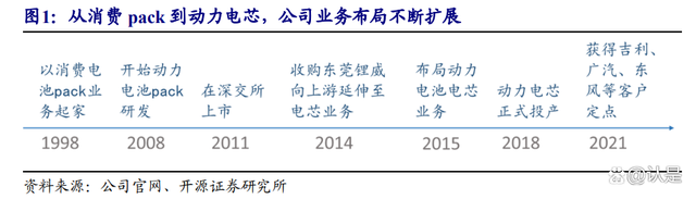 以消费 pack 起家,业务布局不断完善。公司成立于 1998 年,以消费电池的 pack 业务起家,逐渐发展成为全球领先的消费模组厂商,积累了电池模组相关技术的同时也成为公司稳定的现金流来源。2008 年公司借助在消费电池模组的技术,率先开始动力电池 pack 产品相关的研发。2014 年公司收购东莞锂威,完成向更为核心的上游电芯环节的延伸。2015 年起公司开始正式布局动力电池电芯产线,并于 2018 年正式投产,2021 年获得吉利、广汽、东风等大型车企的定点,成为动力电池赛道的新势力,形成了完整的锂电池产业链布局。