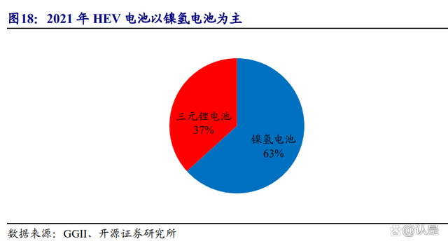 2021 年 HEV 电池以镍氢电池为主,锂电池渗透率有望提升。2021 全年 HEV 电池装机量约 0.79GWh,同比增长 46%。其中,镍氢电池装机量约 0.50GWh,占比 63%;三元电池装机量约 0.29GWh,占比 37%。而据 GGII 统计,2022 年一汽丰田凌放 RAV4 已经由镍氢电池切换为三元锂电池,随着三元锂电池与镍氢电池成本差异的缩小及电池技术、性能指标的提升,锂电池的渗透率有望进一步提升。