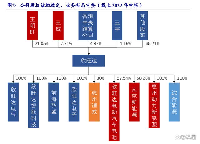 王明旺、王威两兄弟为公司实控人,子公司业务布局完整。王明旺、王威系兄弟关系,2022 年半年报合计持股 28.76%,为公司控股股东和实际控制人,公司股权结构稳定。公司主要参股控股公司中,其中欣旺达电子等 4 家公司主营电池模组相关产品,惠州锂威主营锂电池电芯,欣旺达电动汽车电池等 3 家公司主营动力电池相关业务,综合能源主营储能电池及设备相关业务,业务布局完整。