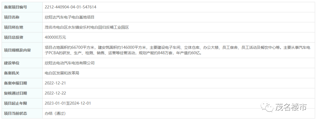 而就在今日,由欣旺达电动汽车电池有限公司投资建设的欣旺达汽车电子电白基地项目在广东省投资项目在线审批监管平台进行了备案公示,明确了项目所在地。