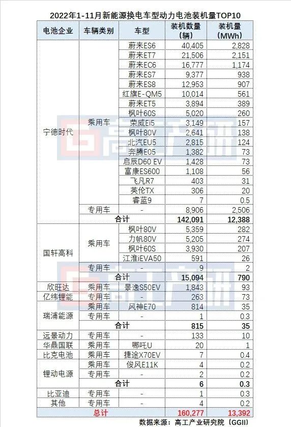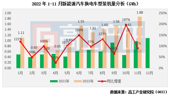 GGII根据新能源汽车交强险口径数据统计显示,2022年1-11月新能源汽车换电车型共计装机约13.39GWh,同比增长101%,占整个新能源汽车动力电池装机量的6.1%。