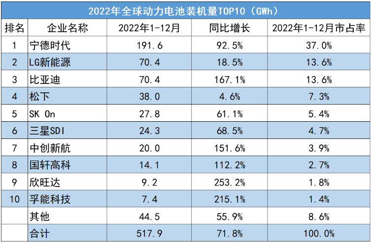 根据韩国市场研究机构SNE Research数据,2022年全球动力电池装机量为517.9GWh,同比增长71.8%。在装机量前十名的企业中,中国动力电池企业占据6个席位,其中宁德时代连续6年夺得全球动力电池市场冠军,比亚迪位列第三,而中创新航、国轩高科、欣旺达、孚能科技分列第七至第十。