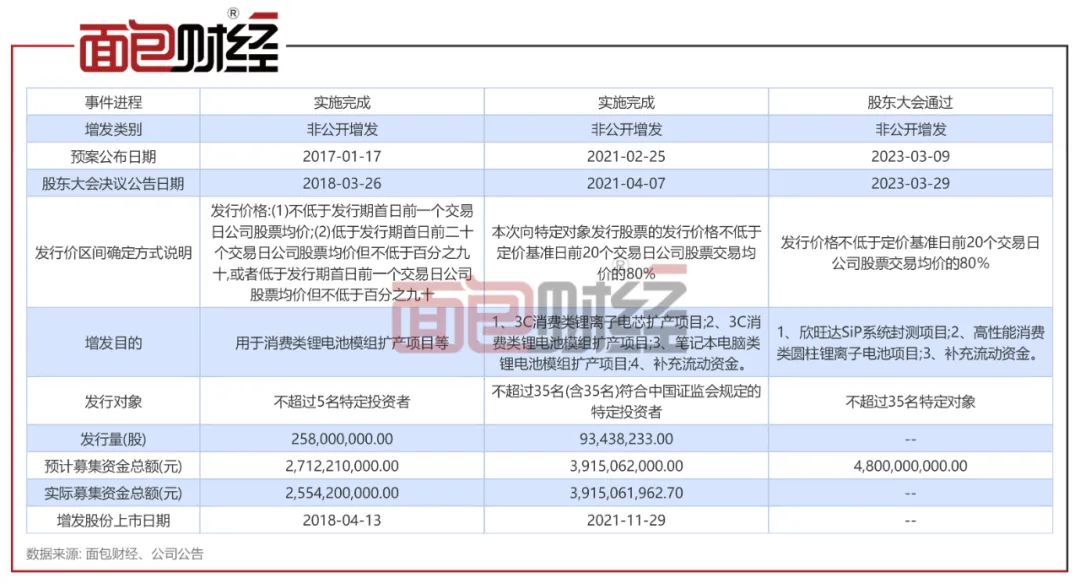 2023年3月9日,欣旺达发布定增预案,拟定增不超约5.59亿股,募资总额不超48亿元。