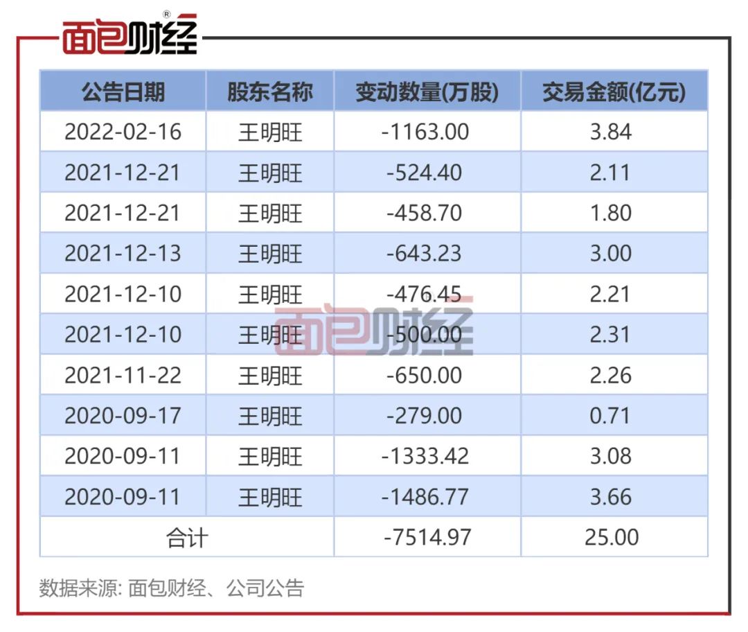 此外,2020年9月至2022年2月期间,实控人王明旺已累计减持约7514.97万股,累计交易金额约25亿元。