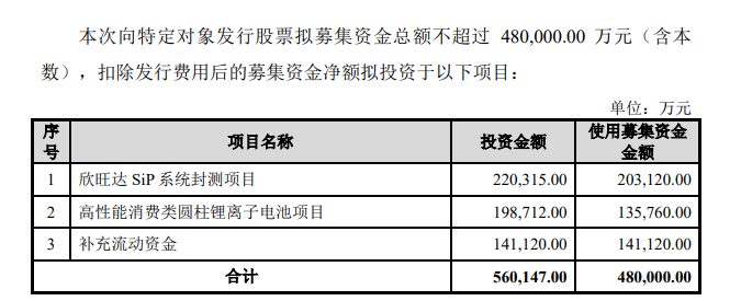 本次募集的资金将投向欣旺达SiP系统封测项目、高性能消费类圆柱锂离子电池项目和补充流动资金。