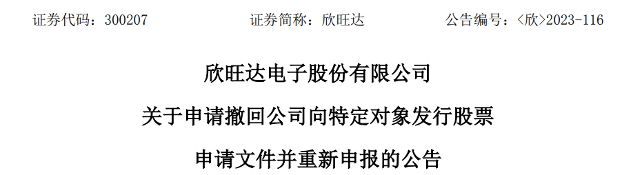 欣旺达称,公司各项业务经营正常,申请撤回向特定对象发行股票申请文件是公司审慎分析并与相关各方充分沟通后提出的,公司将在修订 2023 年度向特定对象发行股票预案并符合相关规定后尽快重新申报,该等事项不会对公司日常经营造成重大不利影响,不会损害公司及股东、特别是中小股东的利益。