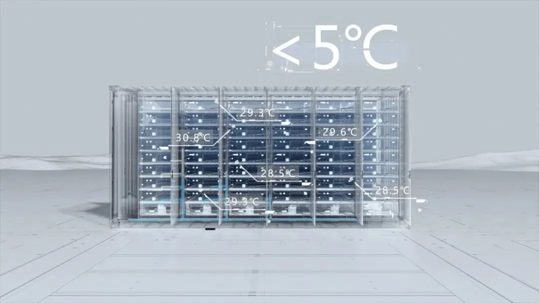 欣旺达5MWh液冷储能系统采用高效智能液冷温控系统,使得系统层级温差小于 5℃,系统温度一致性显著提升,温升明显降低,提升系统循环寿命10%,降低辅助功耗 20%。配合智能管理、智能投切,智能保护等功能,实现系统的极简运维和经济高效。
