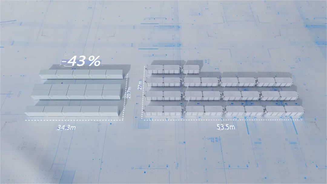 以常规项目容量100MW计算初始投资成本,大容量标准20尺5MWh液冷储能系统比主流3.72MWh产品占地面积节省43%,成本节省26%,大幅度降低储能系统首次购置成本,降本作用凸显。