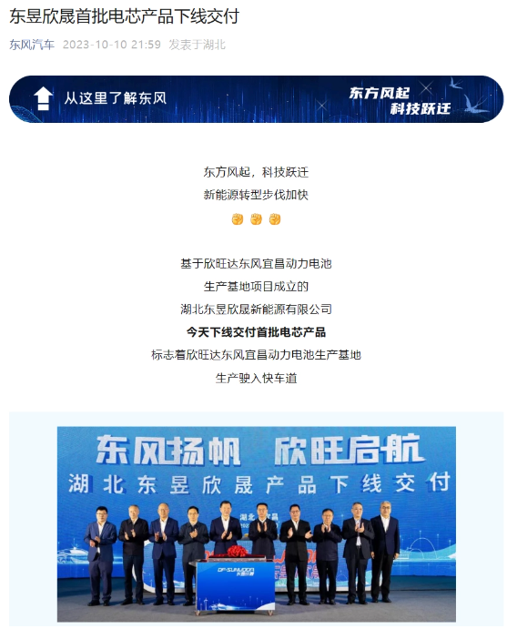 10月11日消息,东风汽车宣布其位于湖北宜昌高新区的欣旺达东风宜昌动力电池生产基地项目成功成立了湖北东昱欣晟新能源有限公司,该公司已于10月10日交付首批电芯产品。