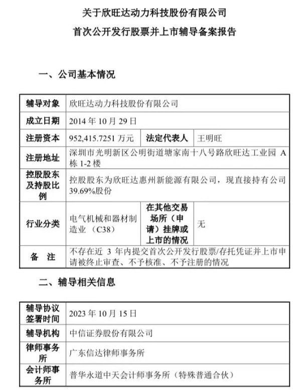 10月17日,中国证监会网站披露,欣旺达动力于10月16日在深圳证监局进行上市辅导备案。备案报告显示,欣旺达动力于今年10月15日签署上市辅导协议,辅导机构为中信证券。
