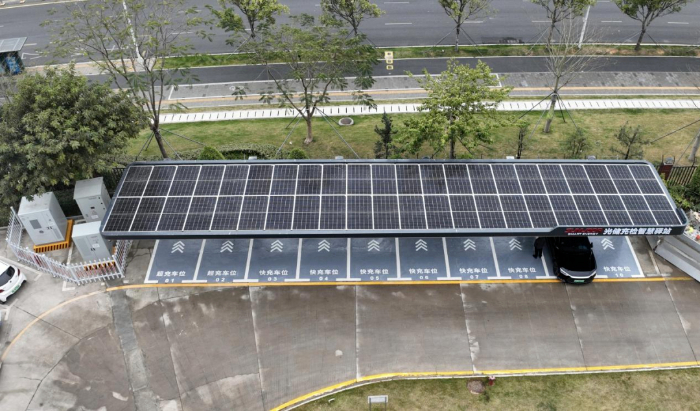 项目建设总面积约350平方米,是集光伏发电、分布式储能、液冷超充、电池检测服务于一体的综合场站。该站采用光伏发电,为新能源车提供绿色电力,车棚铺设光伏板120平方米。项目投用后,年均发电量约2.4万度,每年可节约标准煤7.23吨,减排19.81吨。