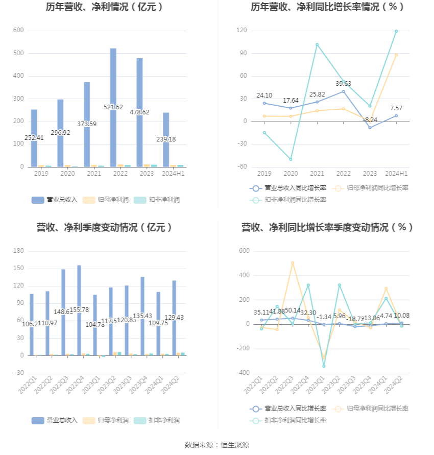 根据半年报,公司第二季度实现营业总收入129.43亿元,同比增长10.08%,环比增长17.94%;归母净利润5.05亿元,同比下降16.25%,环比增长58.54%;扣非净利润5.31亿元,同比下降13.84%,环比增长90.45%。