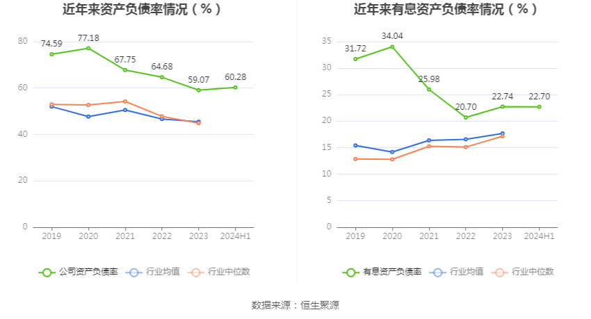 在偿债能力方面,公司2024年上半年末资产负债率为60.28%,相比上年末上升1.21个百分点;有息资产负债率为22.70%,相比上年末下降0.04个百分点。