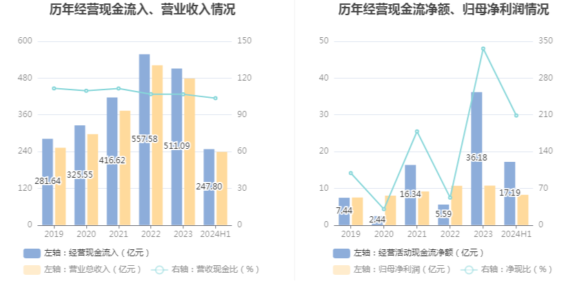 2024年上半年,公司营业收入现金比为103.60%,净现比为208.69%。