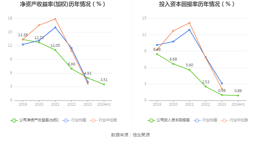 数据显示,2024年上半年公司加权平均净资产收益率为3.51%,较上年同期增长1.37个百分点;公司2024年上半年投入资本回报率为0.89%,较上年同期增长0.61个百分点。