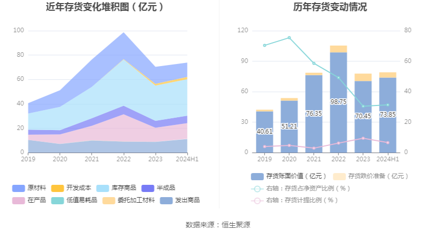 从存货变动来看,截至2024年上半年末,公司存货账面价值为73.85亿元,占净资产的31.37%,较上年末增加3.4亿元。其中,存货跌价准备为5.22亿元,计提比例为6.6%。