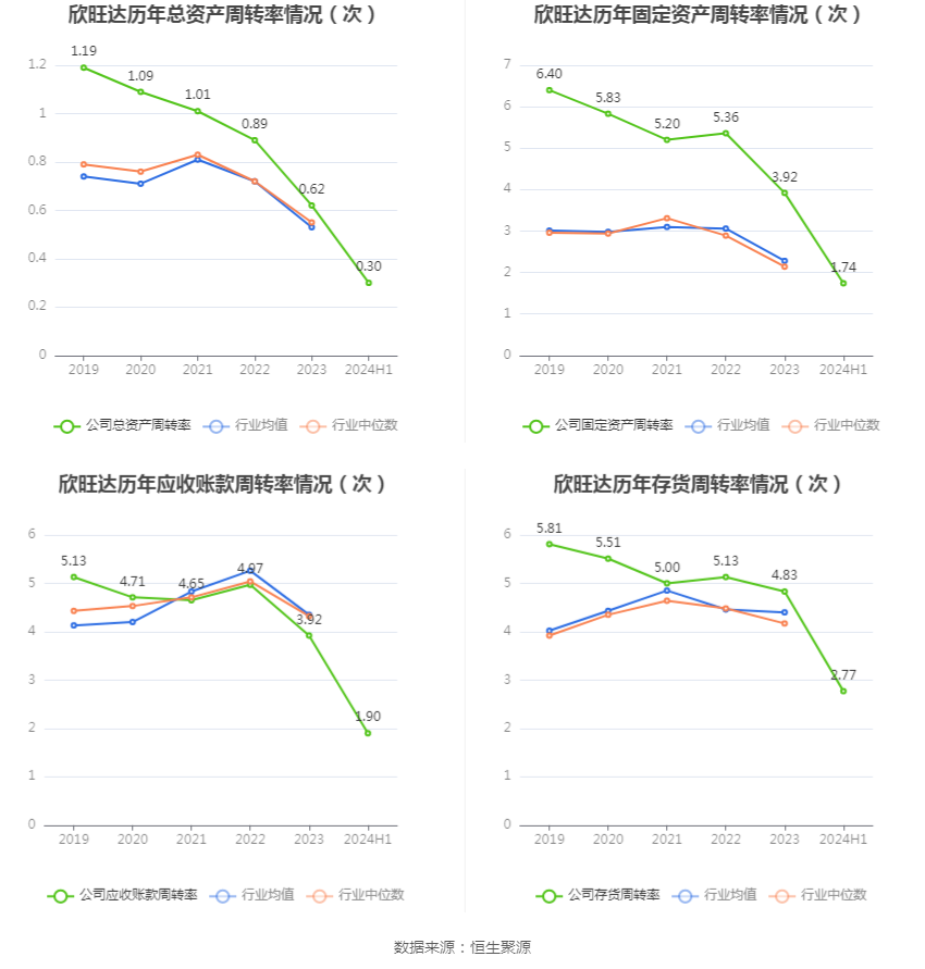 营运能力方面,2024年上半年,公司总资产周转率为0.30次,上年同期为0.29次(2023年上半年行业平均值为0.26次,公司位居同行业11/32);固定资产周转率为1.74次,上年同期为1.89次(2023年上半年行业平均值为1.18次,公司位居同行业9/32);公司应收账款周转率、存货周转率分别为1.90次、2.77次。