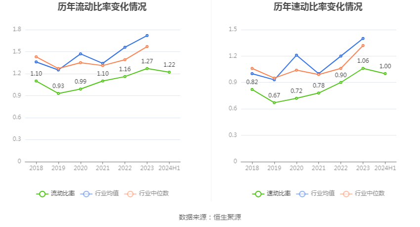 2024年上半年,公司流动比率为1.22,速动比率为1.00。