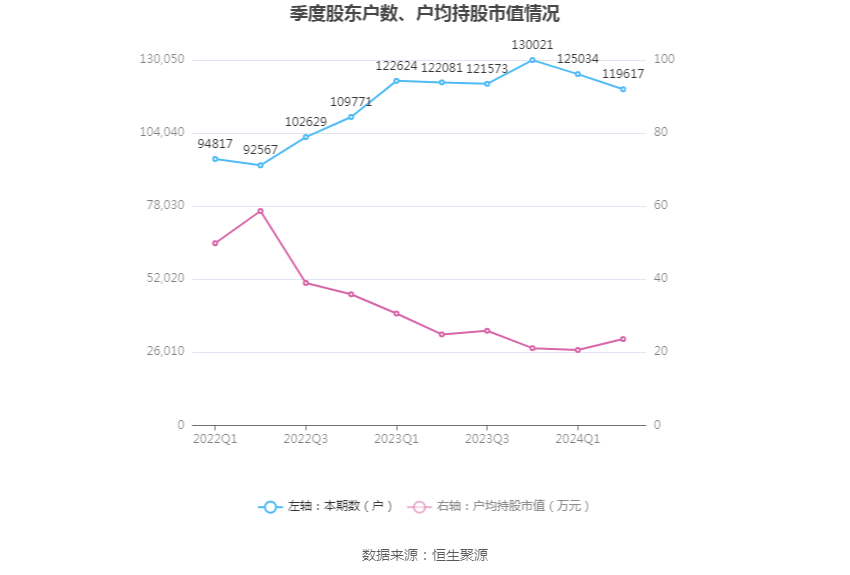 筹码集中度方面,截至2024年上半年末,公司股东总户数为11.96万户,较一季度末下降了5417户,降幅4.33%;户均持股市值由一季度末的20.64万元上升至23.62万元,增幅为14.44%。