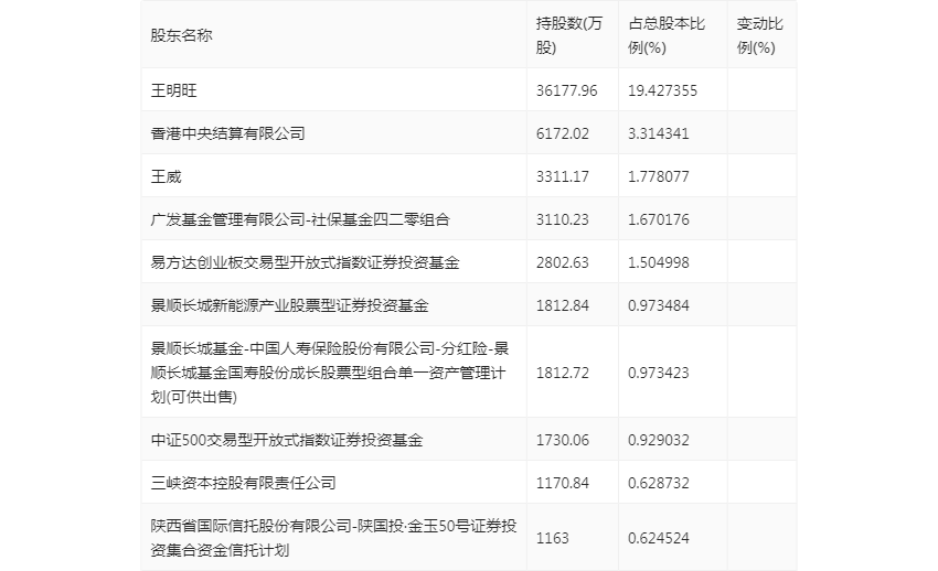 半年报显示,2024年上半年末公司十大流通股东中,持股最多的为王明旺,占比19.43%。十大流通股东名单相比2024年一季报维持不变。在具体持股比例上,香港中央结算有限公司、景顺长城新能源产业股票型证券投资基金、景顺长城基金-中国人寿保险股份有限公司-分红险-景顺长城基金国寿股份成长股票型组合单一资产管理计划(可供出售)、中证500交易型开放式指数证券投资基金持股有所上升,易方达创业板交易型开放式指数证券投资基金持股有所下降。